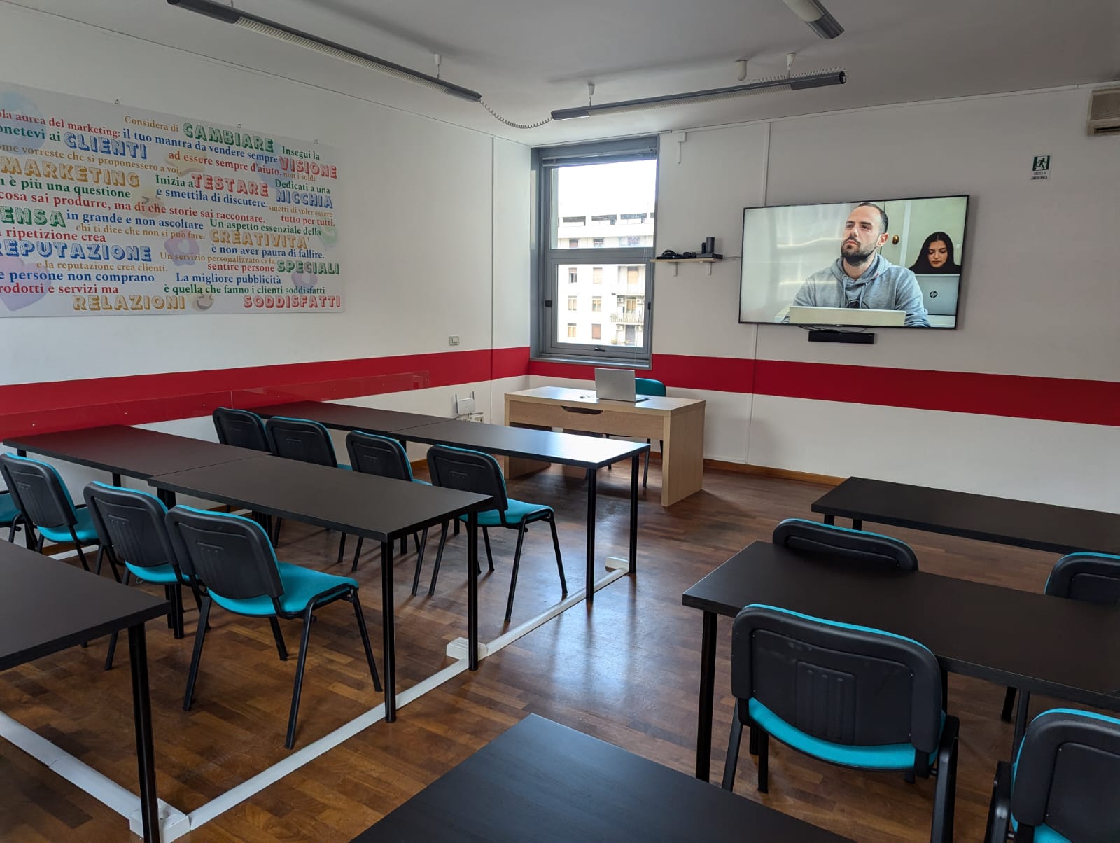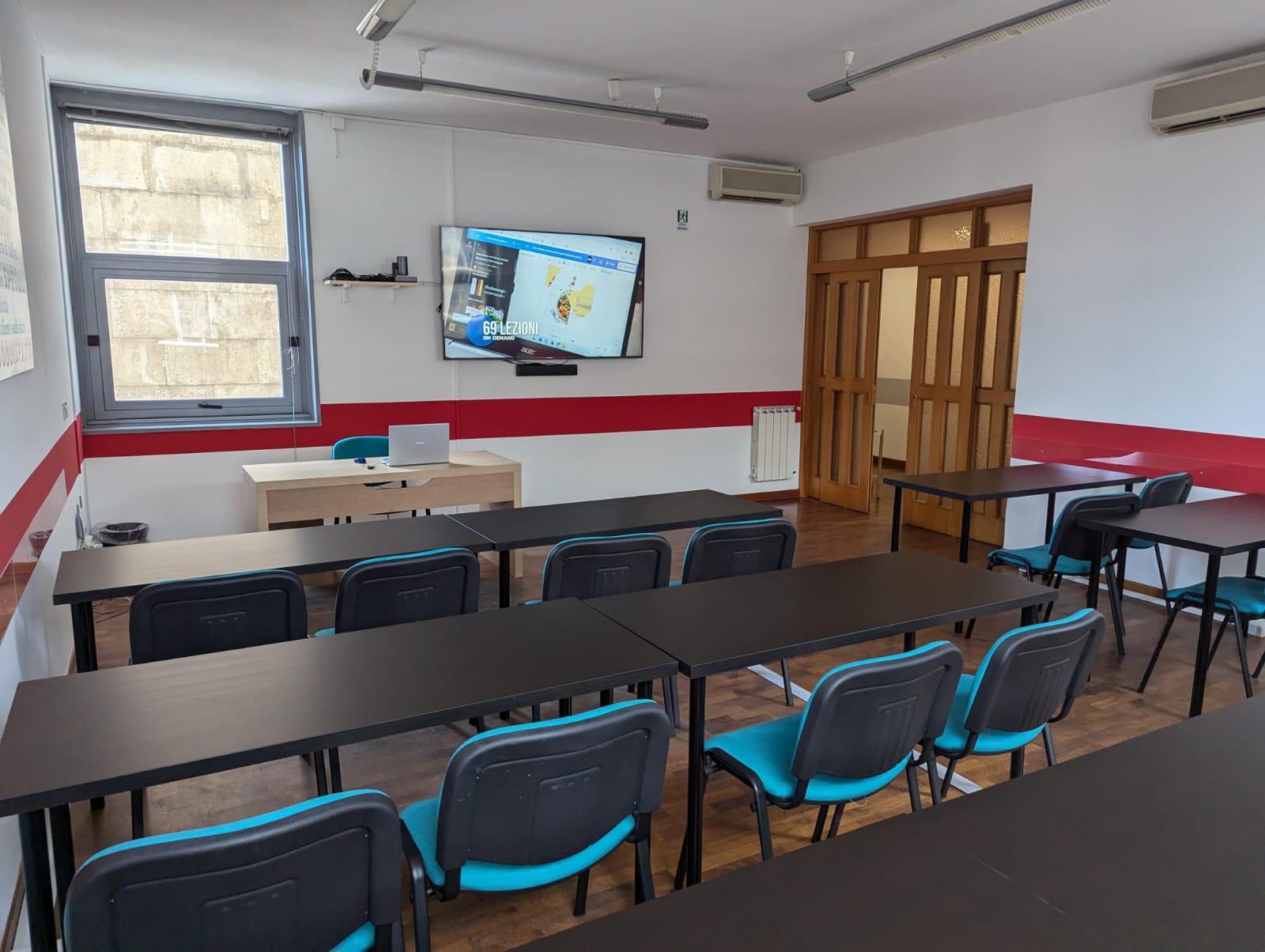La Sala rossa è la più gande delle nostre Aule può ospitare fino a 40 persona in modalità Platea e 18 con Banco.