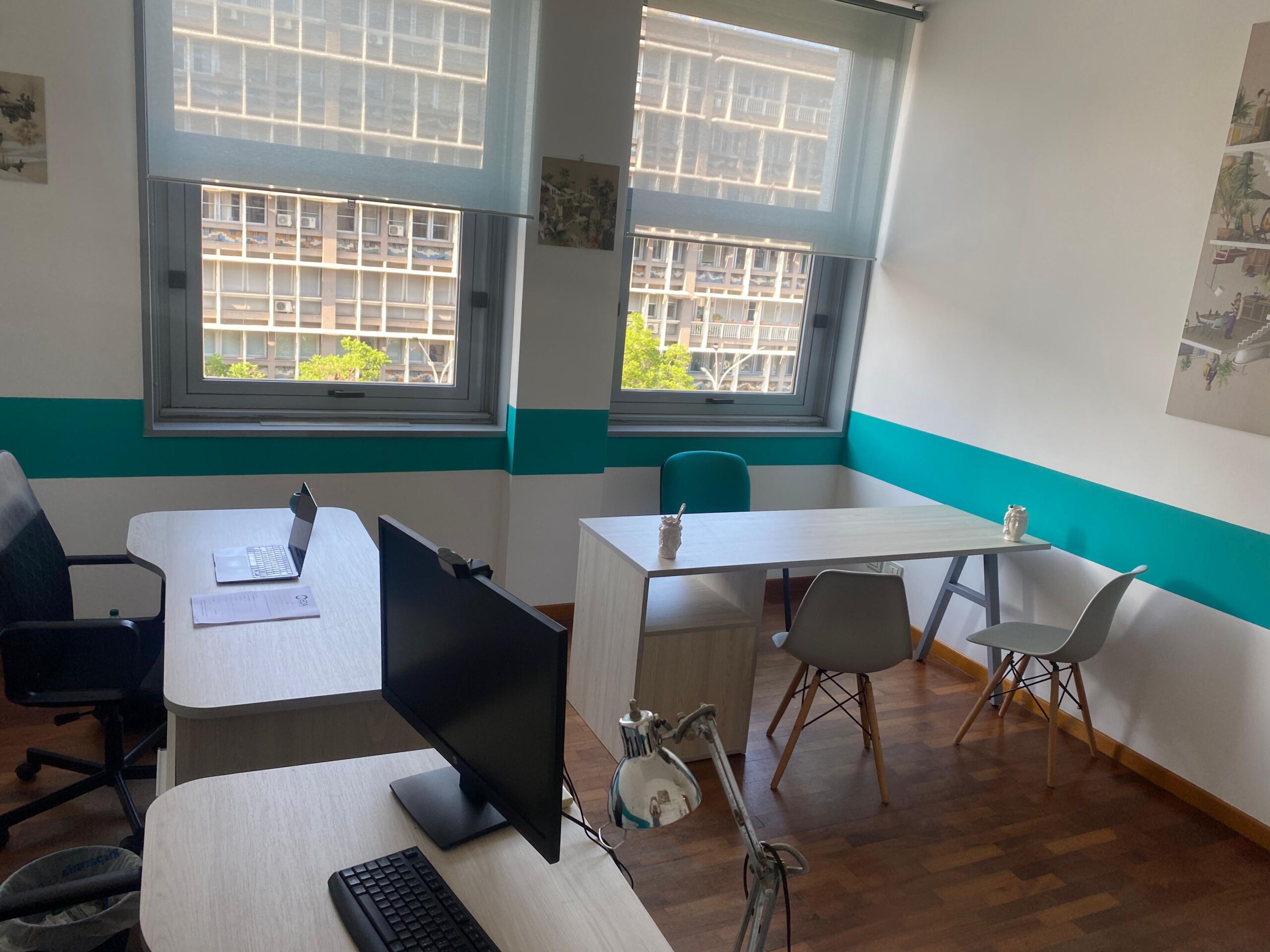 La Sala Verde  è perfetta un ufficio perfetto per ricevere clienti e organizzare colloqui di lavoro. Dotata di tre scrivanie ottimo ambiente per avere un ufficio al centro anche solo per una giornata.